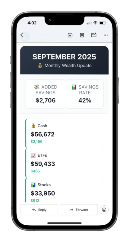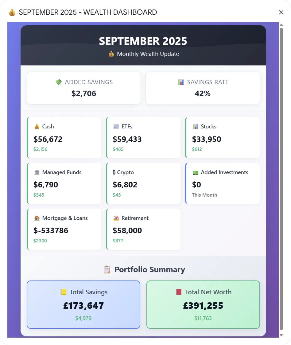 Tracks your monthly Net Worth (including Investments, Property, Retirement Funds, Side Income etc) alongside expenses each month, resulting in an easy to read monthly report.